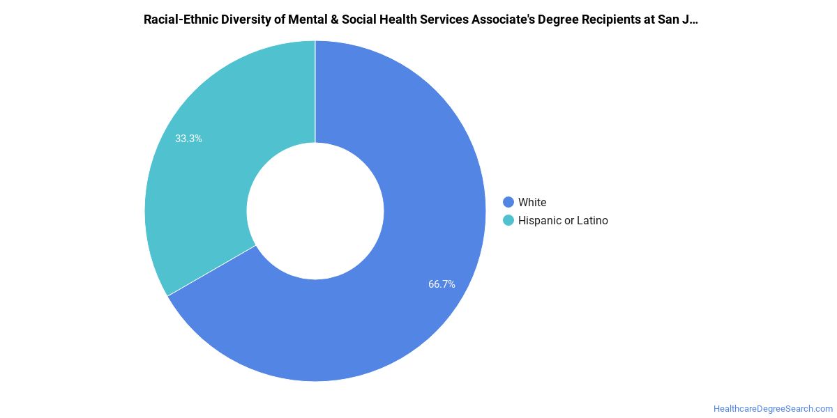 The majority of those who receive an associate's degree in mental health services at San Jose City College are white. Around 67% fell into this category, which is below average for this degree.